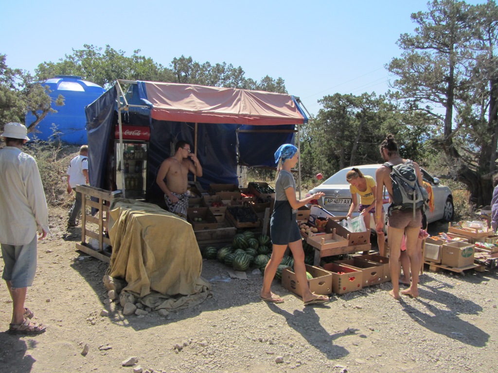 Ну а для тех, кто хочет еще немного сэкономить на питании в «сказочном городе», на территорию палаточного крымского городка подвозят различные свежие овощи и фрукты. Цены правда тоже довольно дорогие, если учитывать средние цены по Украине, но для южного берега Крыма (ЮБК) цены были вполне стандартные.