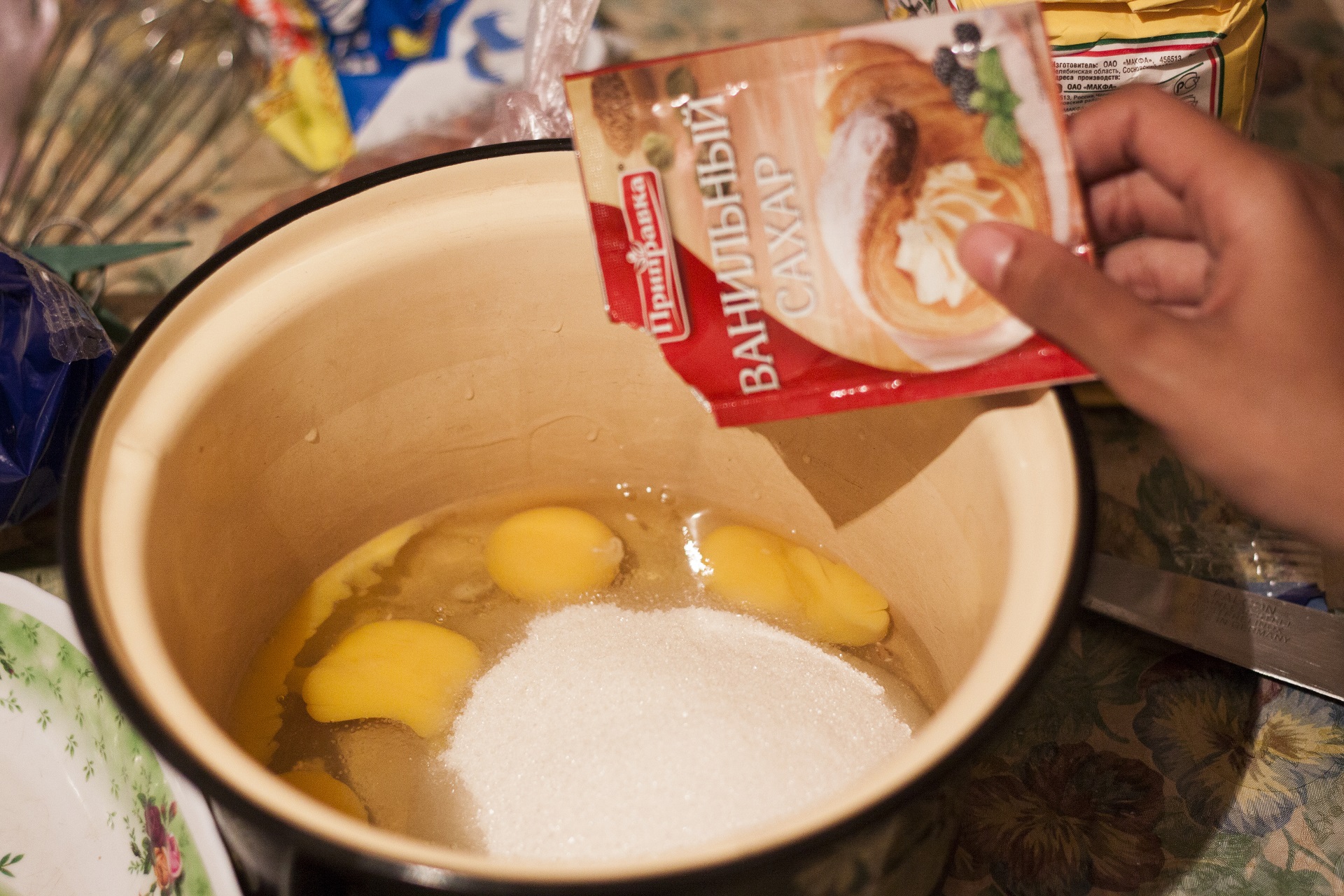 - В отдельной кастрюле взбиваем яйца со всем сахаром и ванилином, до густой пены.
