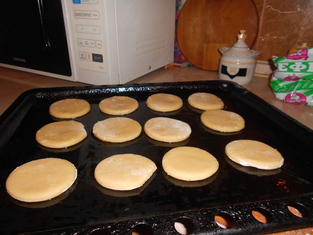Раскатайте тесто скалкой до толщины примерно 8-10 миллиметров. При помощи стопки вырежьте кружочки.