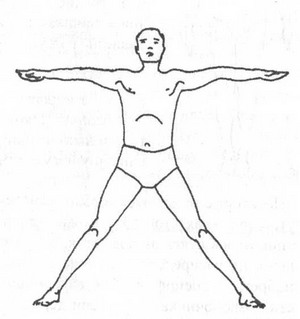 - Глубоко вдохните и с прыжком расставьте ноги на 100-120 см. Расположите руки параллельно полу в противоположные стороны перпендикулярно вашим бокам. Ладони направлены вниз. Смотрите рисунок мужчины чуть выше.