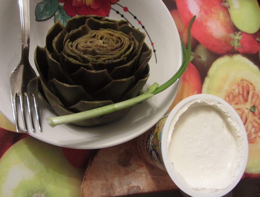 Ну и остается самое сложное, артишок еще нужно правильно есть. Артишок едят руками, отламывая каждый листик отдельно, и макая его в белый соус. Вообще соус это достаточно важный пункт в процессе поедания артишока. Я конечно использовал обычную сметану, но было и не так вкусно, тут более подойдет что-то острое, чесночное масло, да и любой белый соус, даже просто купленный в магазине, а еще лучше самостоятельно приготовленный.