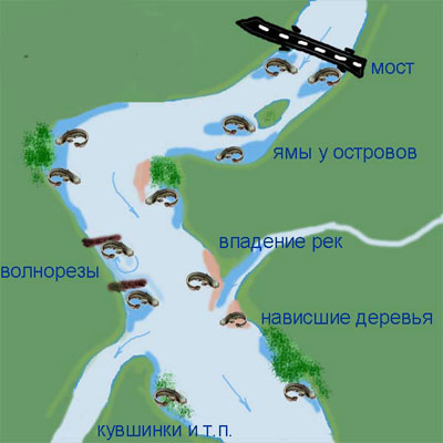 Сом предпочитает теплую воду – холодных и мелководных рек сом старается избегать. Главный признак наличия сома на том или ином участке — это достаточно глубокая яма в тихом месте реки с наличием коряг и растительности. «Сомятникам» известно, что сом предпочитает именно такие места.