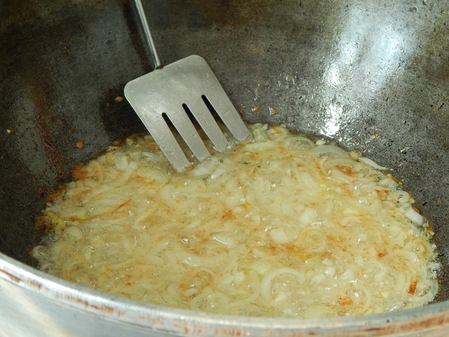 В казане с толстыми стенками накалите масло и начинайте обжаривать на среднем огне лук до золотисто-коричневого цвета, постоянно перемешивая его. Если лук жарить до коричневого цвета, то плов получится более темным.