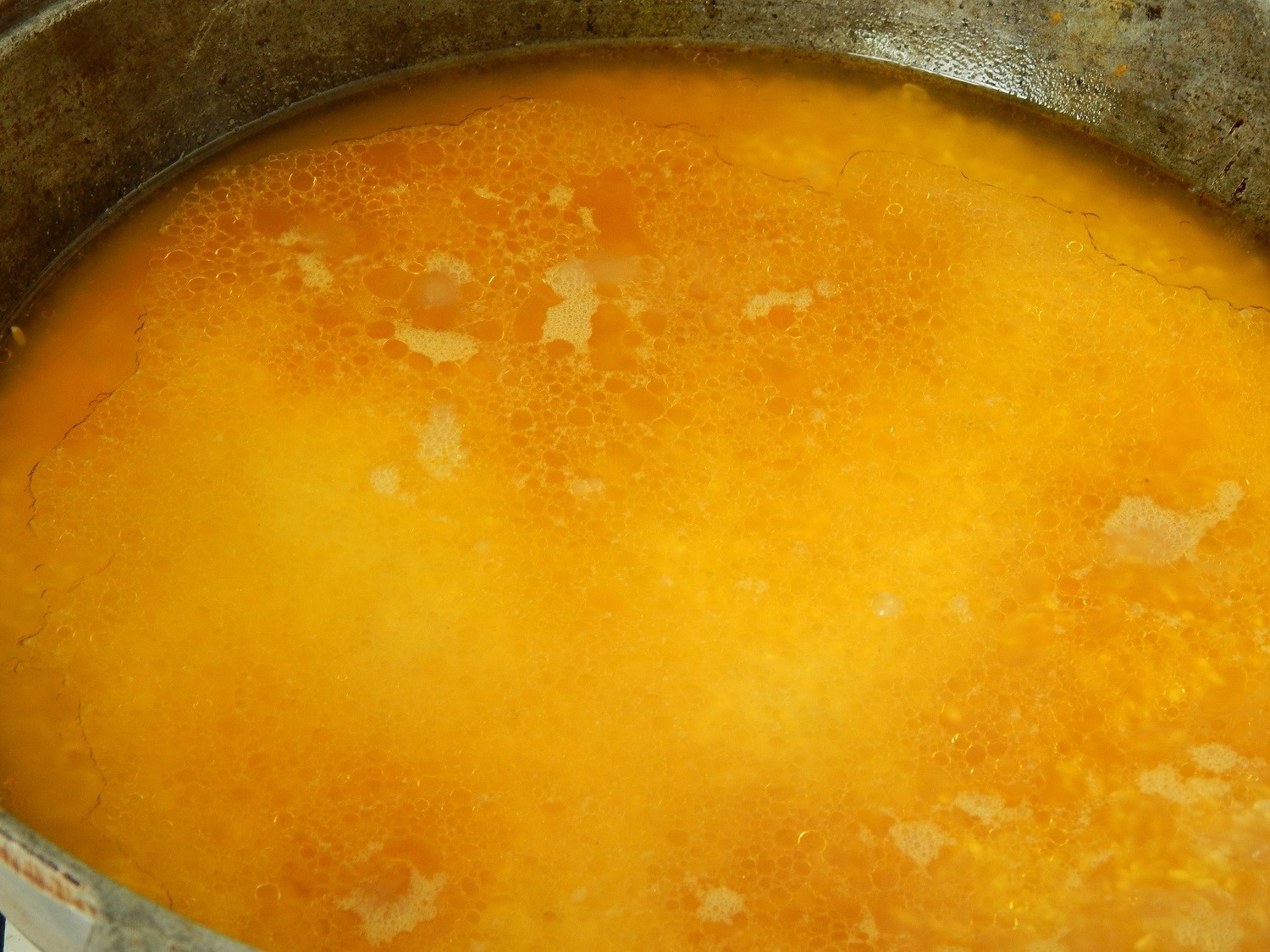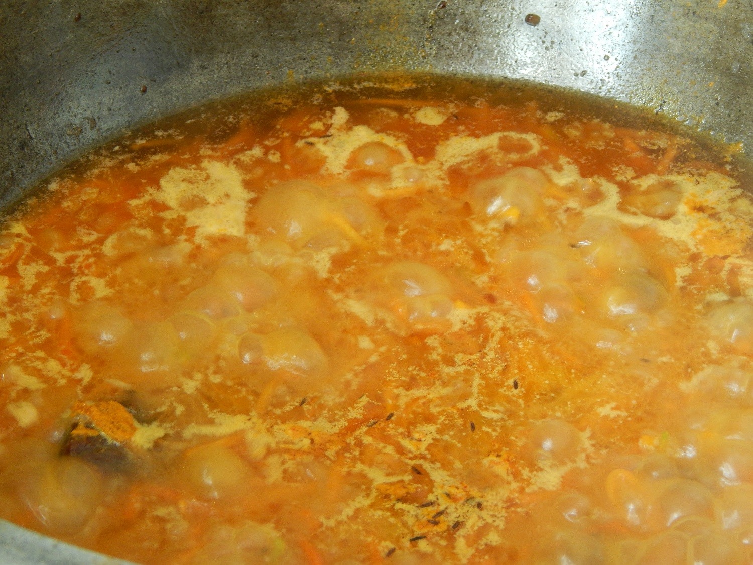 Сделайте огонь максимально сильным и доведите до кипения. Добавьте специи и соль. Вкус должен быть слегка солоноватым, потому что после добавления риса соленость уменьшится.