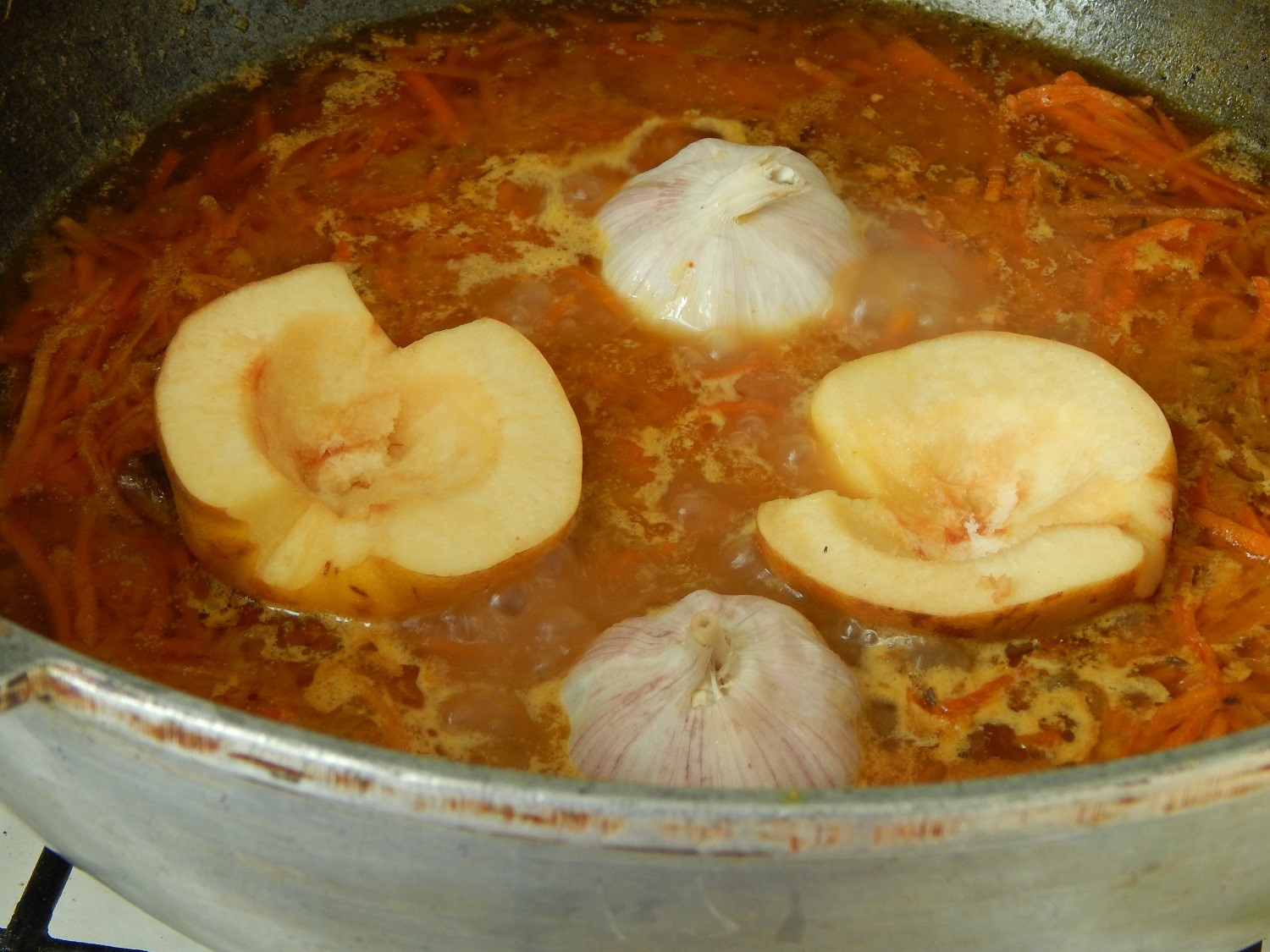 У чеснока удалите корневище и верхний слой шелухи. От зирвака во многом зависит вкус плова: все продукты должны обогатиться вкусом друг друга, поэтому не торопитесь закладывать в плов рис. В общей сложности зирвак готовится около 40-45 минут. Перед закладкой риса положите в зирвак 2 головки чеснока и разрезанную на части айву.