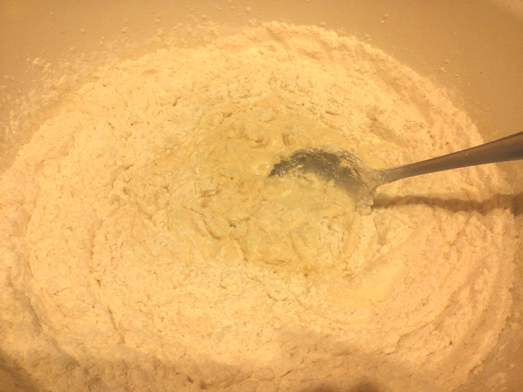 Просеянную муку постепенно вводите в тесто, вначале размешивая ложкой.