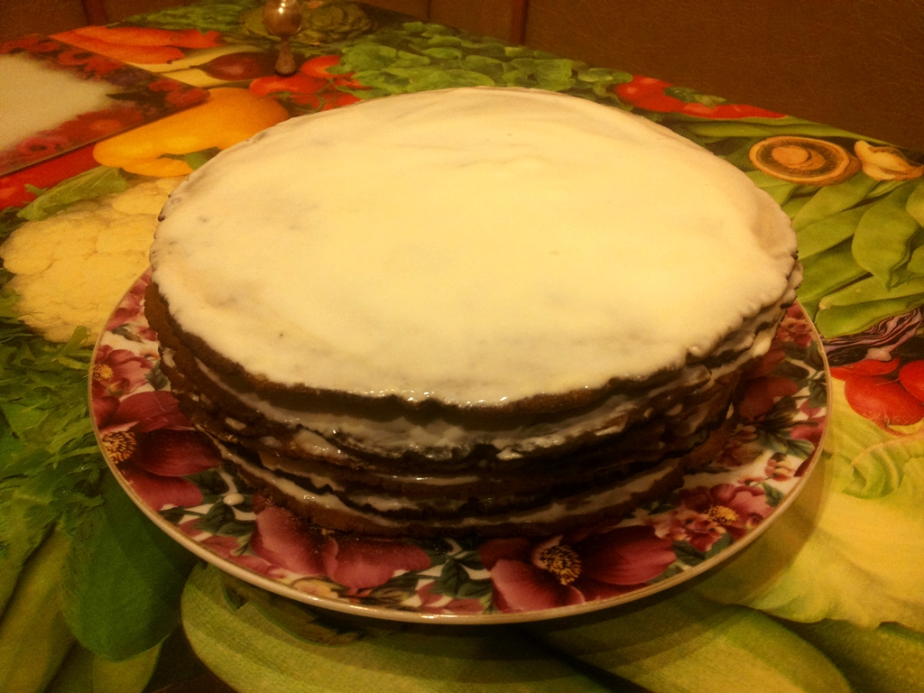 Промазанный торт поставьте в прохладное место на ночь, чтобы пропитаться.