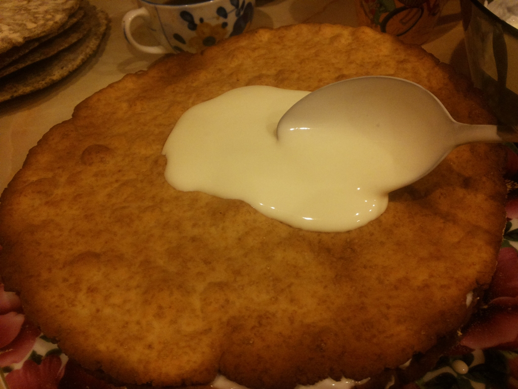 Так как коржи не идеально ровные, с бугорками, и торт сначала будет получаться неровный. Не нужно пытаться придавить его и выровнять, иначе коржи могут лопнуть. Дайте время и, пропитавшись, коржи размякнут и выровняются.