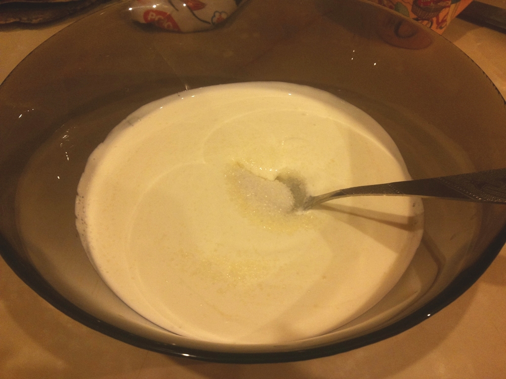 Сметану для крема необходимо брать густую. Коржи достаточно сухие и сладкие, поэтому жидкая сметана будет слишком быстро растекаться и слабо пропитает коржи. В миске размешайте сметану с сахаром всыпьте ванилин на кончике ножа. Размешайте крем до полного растворения сахара.