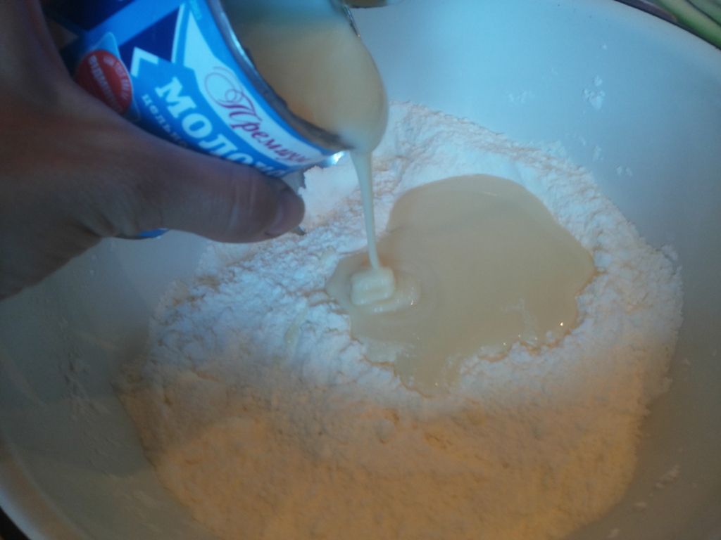 Ссыпав вашу смесь в глубокую миску, постепенно перемешивая, вводите сгущенное молоко. Для приготовления мастики понадобится около половины банки сгущенки. Влив ее, хорошенько вымешивайте мастику.