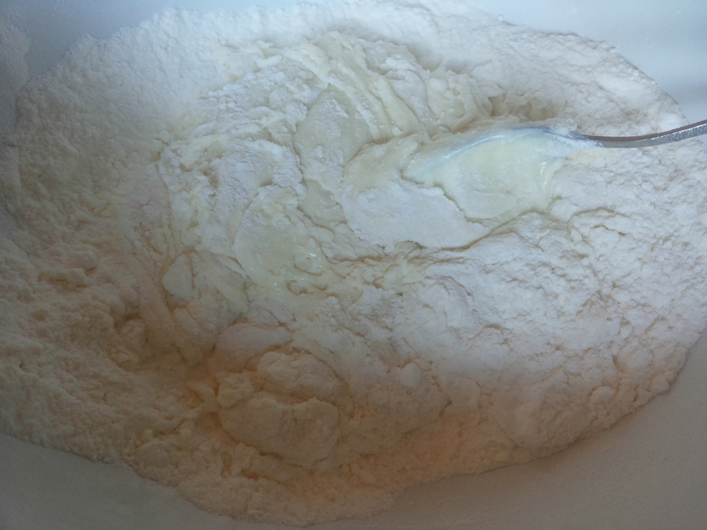 Начните вымешивать смесь сначала ложкой, а когда смесь загустеет, следует вымешивать руками.