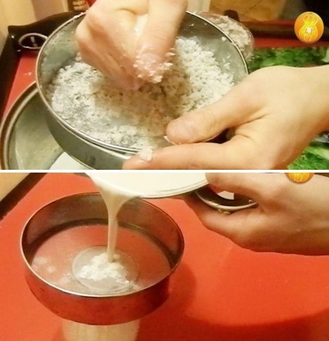 Перемалываем в блендере, можно добавить еще кокосовой воды. Выкладываем содержимое на ситечко и отжимаем, если его нет, можно использовать марлю.
