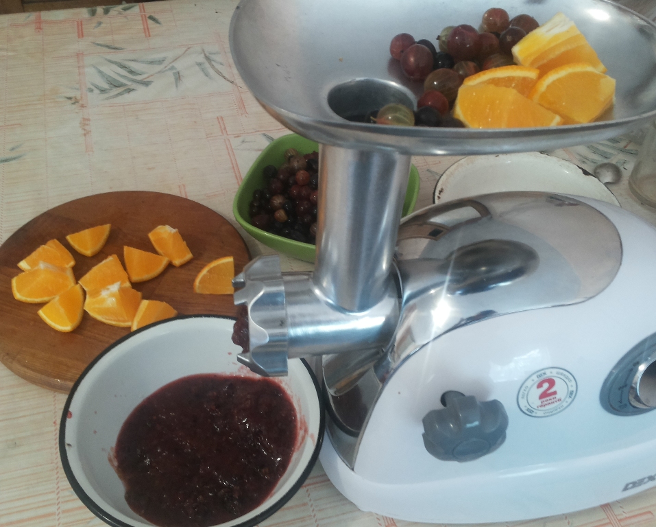 Для приготовления варенья крыжовник перебираем, удалив поврежденные плоды, если таковые имеются и моем. Очищаем от хвостиков и плодоножек. Перекручиваем в мясорубке.