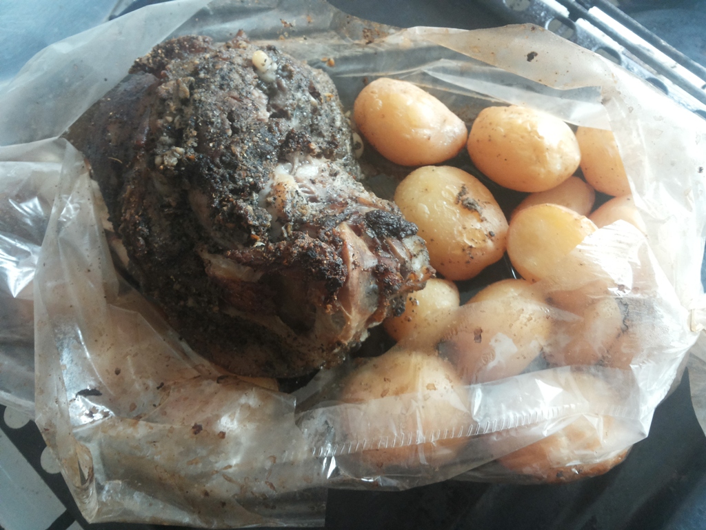 Заключенная в рукав свиная рулька будет равномерно пропекаться и пропитывать своим ароматным соком картофель. Поэтому в результате вам удастся вкусно приготовить и свиную рульку, и картофель.