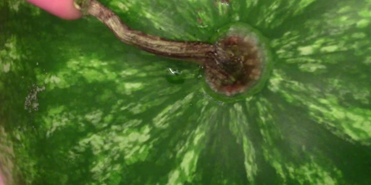 Теперь чтобы определить спелый ли перед вами арбуз, посмотрим на хвостик арбуза. Когда наша крупная ягодка растет, она как пуповиной крепится к стеблю ее питающему. У созревшего арбуза необходимость в подпитке отпадает и постепенно хвостик, которым он крепился, отсыхает. Но засыхает не только сам хвостик, но и пятнышко из которого он растет. Если арбуз сорван зеленым, хвостик в любом случае со временем начнет подсыхать, а вот пятнышко нет. А если даже хвостик имеет сочный зеленый вид, то арбуз совсем зеленый.