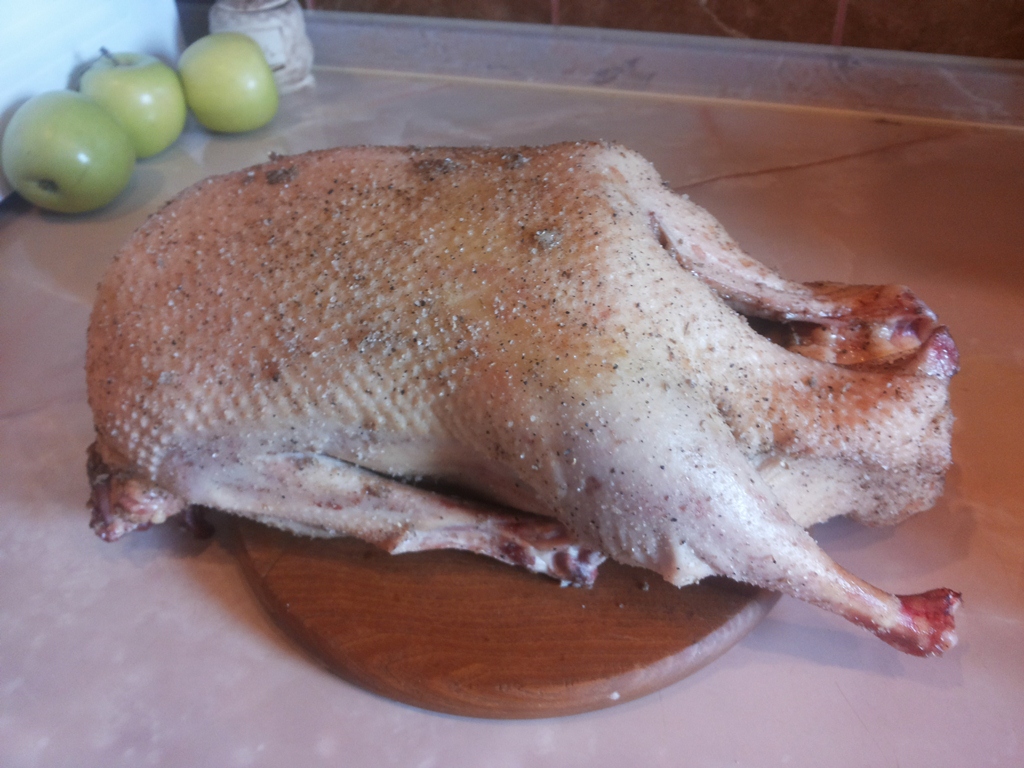 Тушка гуся надлежащим образом ощипанная и выпотрошенная. Для запекания гуся с яблоками необходимо чтобы внутри тушки отсутствовали потроха: сердце, печень и желудок. Используйте их для приготовления других блюд, если, конечно, в купленной вами тушке они были. Хозяйки же, выращивающие дома гусей, обычно удаляют все внутренности сразу.