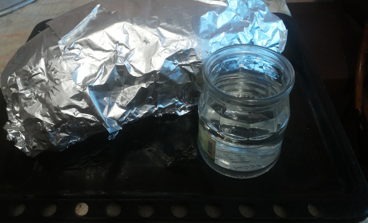 Духовку, для запекания гуся, разогреваем до 180-200ºС. Промаринованную тушку оборачиваем пищевой фольгой и выкладываем на противень. Если у вас обычная духовка, как в принципе и у меня, и в ней нет функции пара, рядом на лист для запекания ставим полулитровую банку с водой.