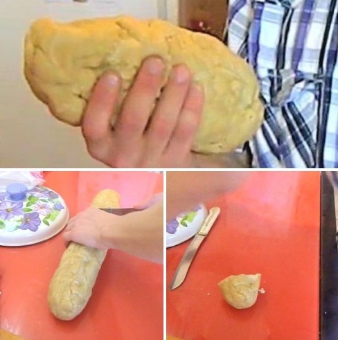Затем тесто раскатываем в форме колбасы и делим ее на отрезки. У меня получилось 8 равномерных отрезков, отрываем один из них и раскатываем, а нашу колбаску из остального теста не забываем накрывать тряпочкой или пленкой.