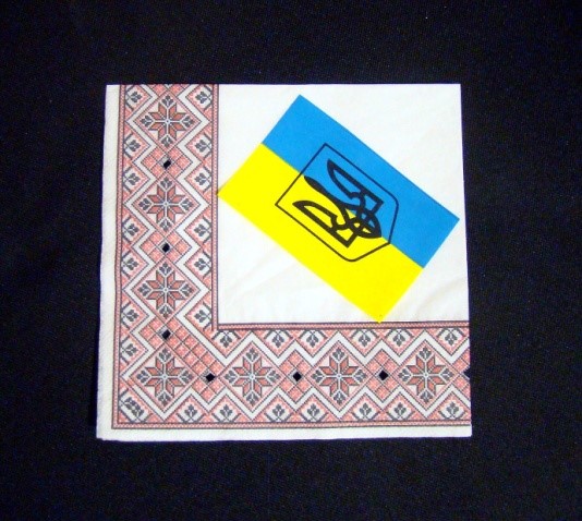 - салфетки — для декупажа в украинском народном стиле я выбрала обычные столовые с орнаментом «вышиванка» и вырезка из журнала флаг Украины.