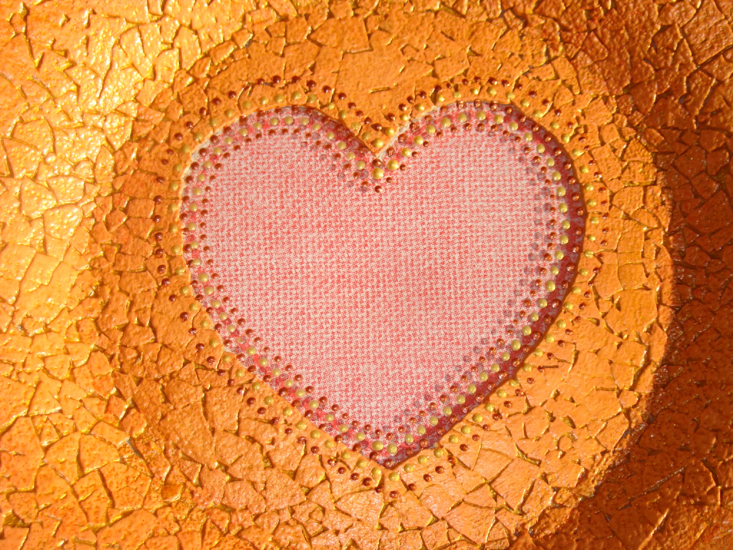 На финишном этапе мы придадим законченный вид нашей работе. Воспользуемся контурными красками для стекла и керамики Decola, цвета – медь и золото. Просто по контуру сердечка наносим точки, чередуя цвета.