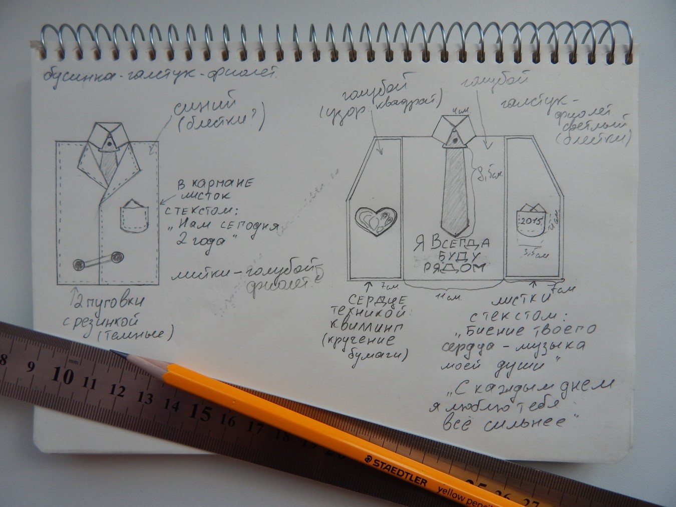 - Отдельно делаем кармашки, и листки с пожеланием. Наносим при помощи красок штриховку по краю пиджака и на кармашках, как бы делая шов.