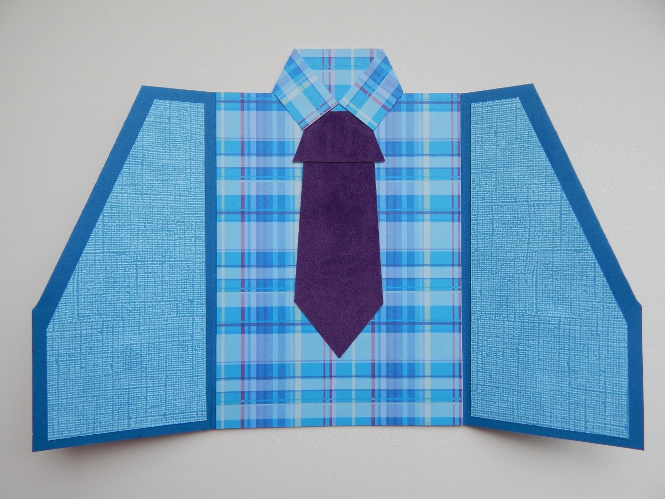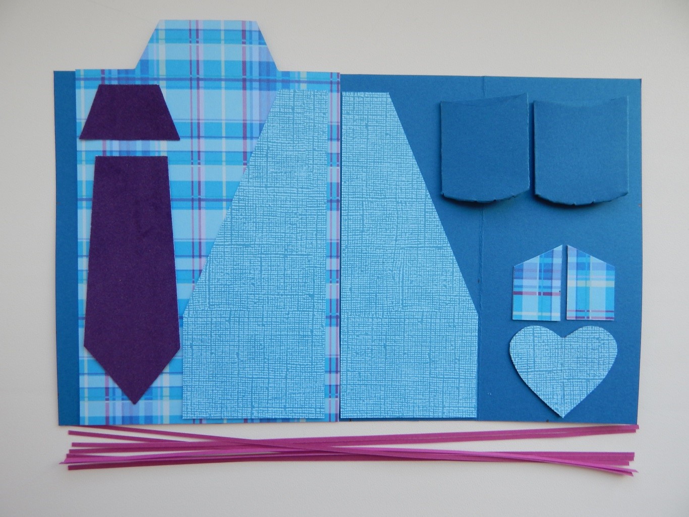 - Сначала лучше всего склеить основу хенд мейд открытки для нашего мужчины, и уже в конце приклеивать маленькие детали. Рубашку приклеиваем на пиджак и только потом сгибаем края, после отгибаем воротник и приклеиваем подкладку во внутреннюю сторону пиджака.