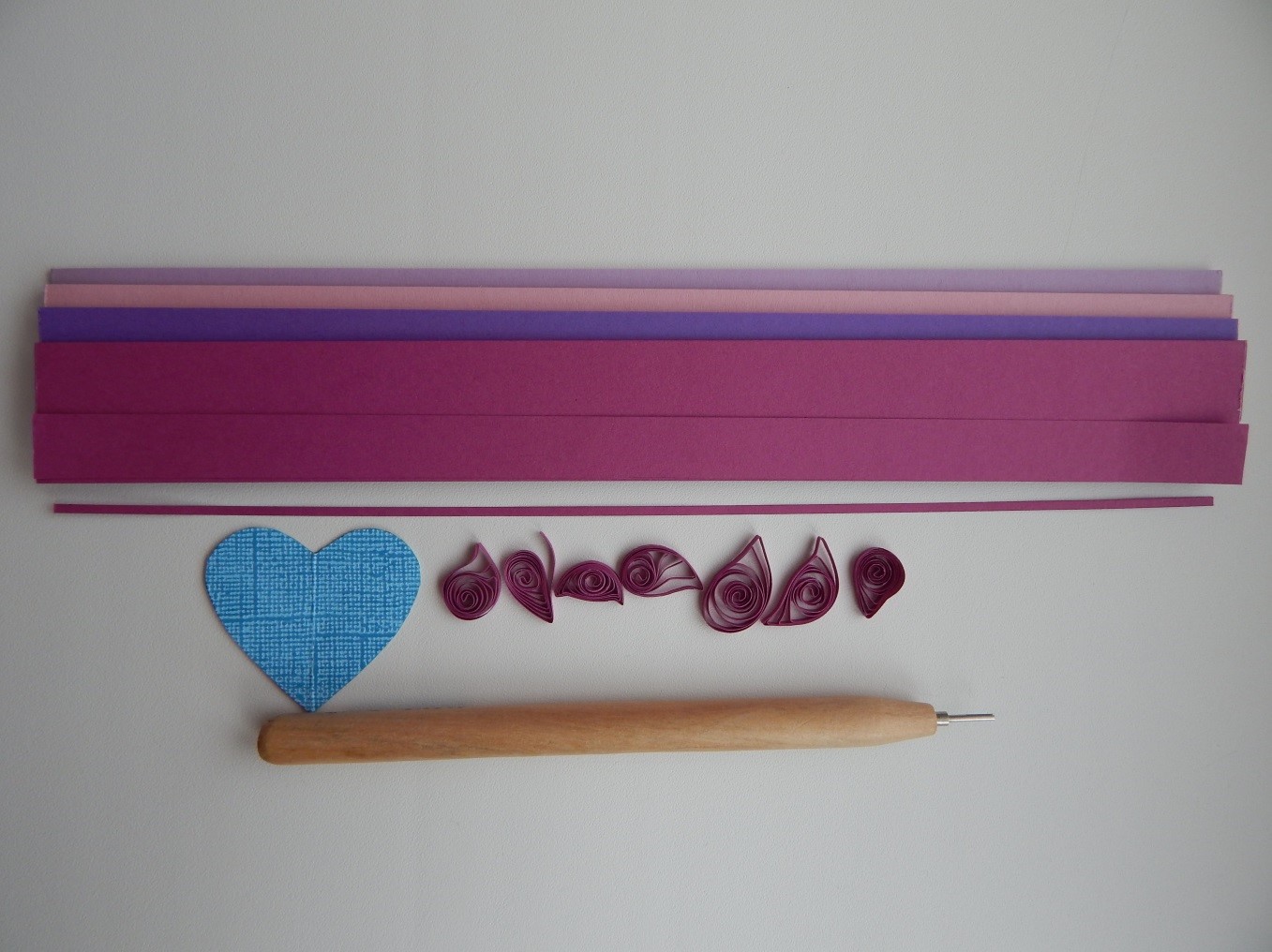 - Подбираем размер сердца под открытку. При помощи инструмента для закручивания бумажных лент делаем заготовки, из которых будем после складывать наше сердце. Приклеиваем сердце на открытку.