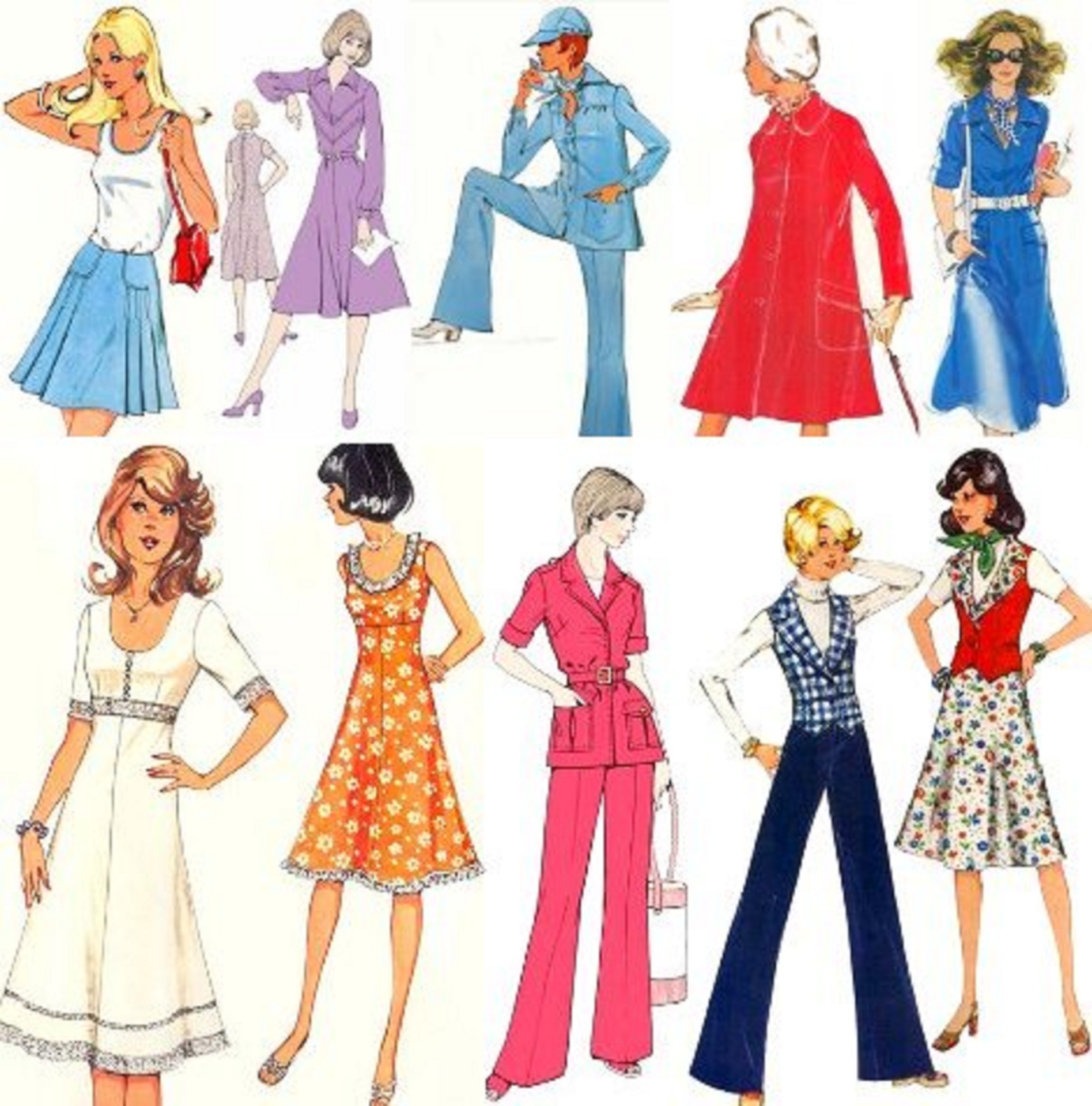 Эклектичная мужская и женская мода на одежду 70-х годов XX века вобрала в себя различные стили и направления, среди которых хиппи, диско, ретро, деловой, этнический, унисекс, сафари и многие другие. Из моды прошлого десятилетия сюда шагнула тенденция преимущественно геометрических форм и облегающих силуэтов в одежде, длина мини и макси, яркие расцветки, богатый выбор тканей и отделок.