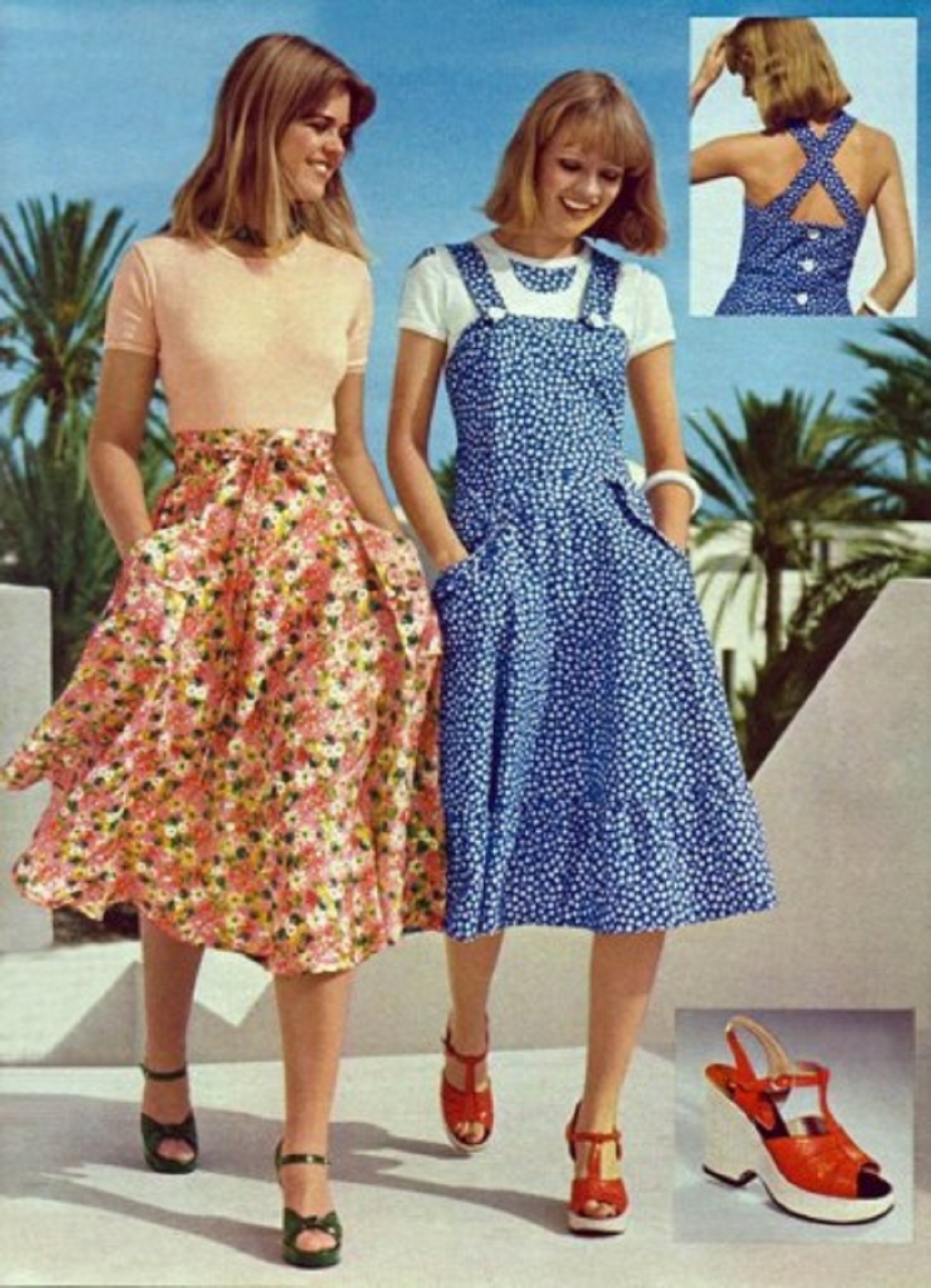 Невероятный спрос и популярность приобрели сарафаны, которые носили не только жарким летом, но и в холодные времена года, дополняв их водолазкой или батником. К слову, 70-е – это пик моды на однотонную водолазку, удобную и элегантную, которую легко сочетать с любым предметом одежды.