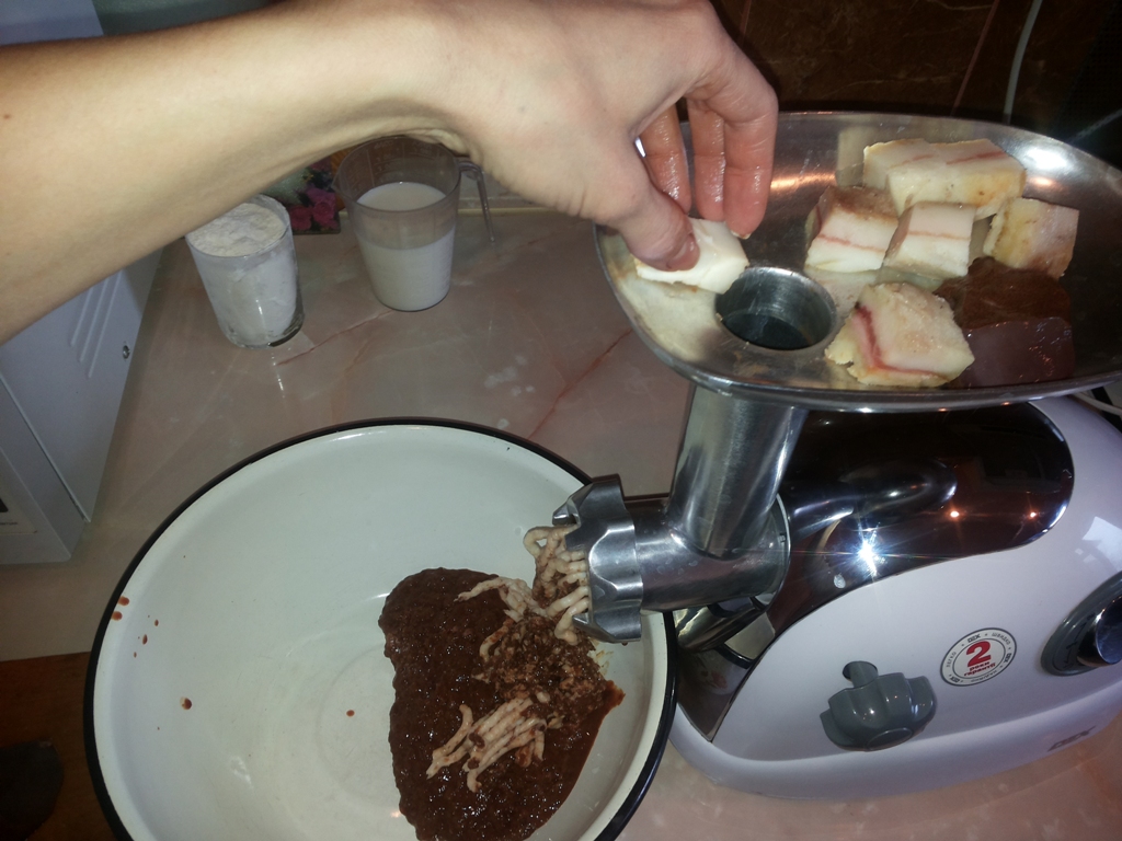 С сала срезать шкурку. Какой бы мягкой она не была, но при измельчении кусочки все равно будут чувствоваться. В мясорубке перекрутить печень и сало.