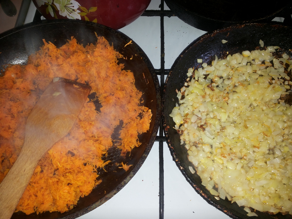 На другой сковороде, также, припускаем лук до прозрачно-золотистого цвета.