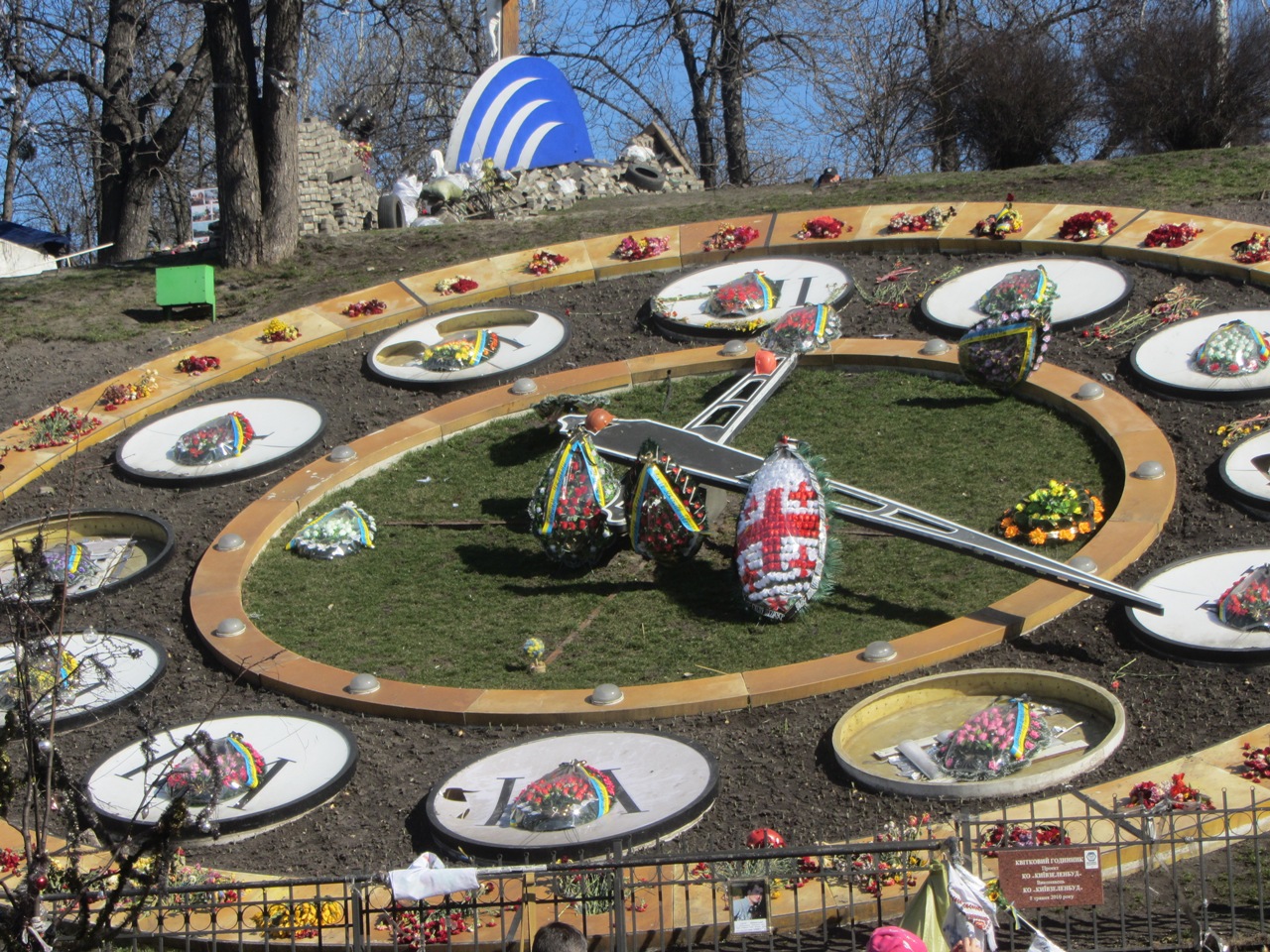 В общем, портретов погибших милиционеров я не видел, хотя было еще довольно много мест где выкладывали цветы целыми горками, аллеями, где-то цветами написано «героям слава», есть даже цветы в форме пасхальных яиц, но кому они предназначены известно только тем людям которые их там оставляли, будем считать что цветы родине и матери Украине потерявшей своих детей.