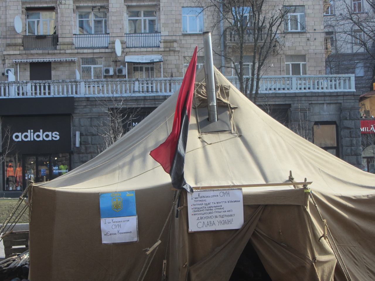 Тут и флаги ОУН УПА терзавших в свое время всю Украину и уничтожавших русскоязычное население, и даже воевавших на стороне фашистов, также на одной палатке просьба помогать деньгами ОУН (украинским националистам).