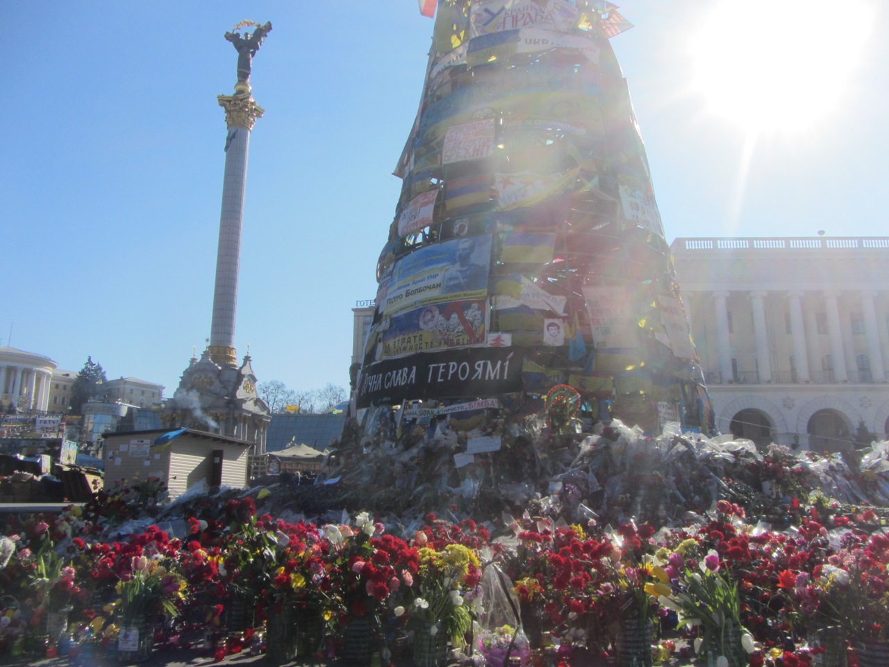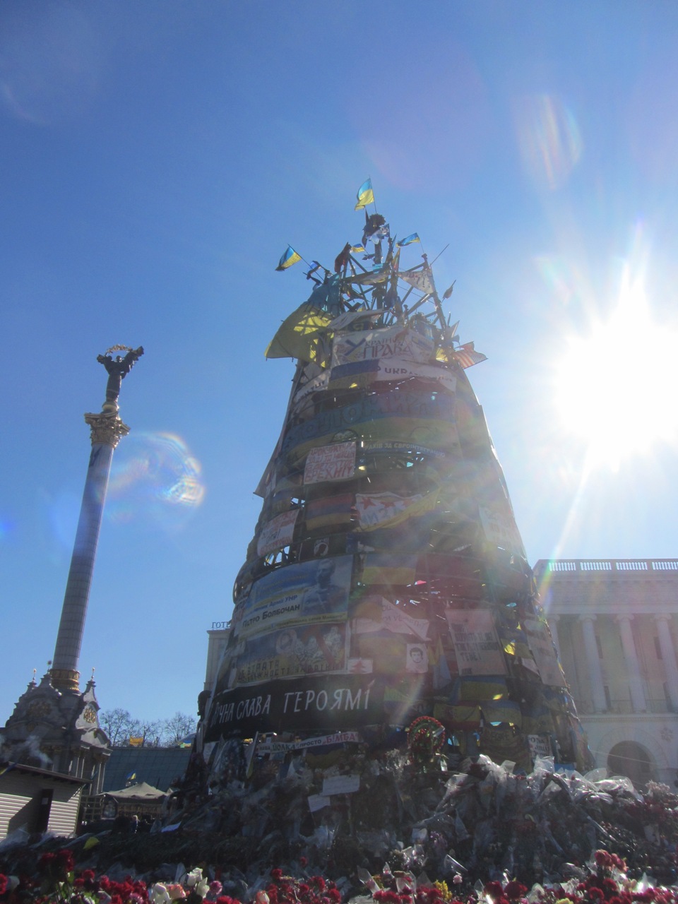 Затем нельзя было не обратить внимания на большое самодельное сооружение, как я понимаю в новый год исполнявшее роль новогодней ёлки, а сейчас превратившееся в постамент памяти погибших в этой гражданской войне, народа Украины не состоящего на службе в милиции, с народом Украины отдавшим присягу Украине и её народу, и от него же погибших в итоге.