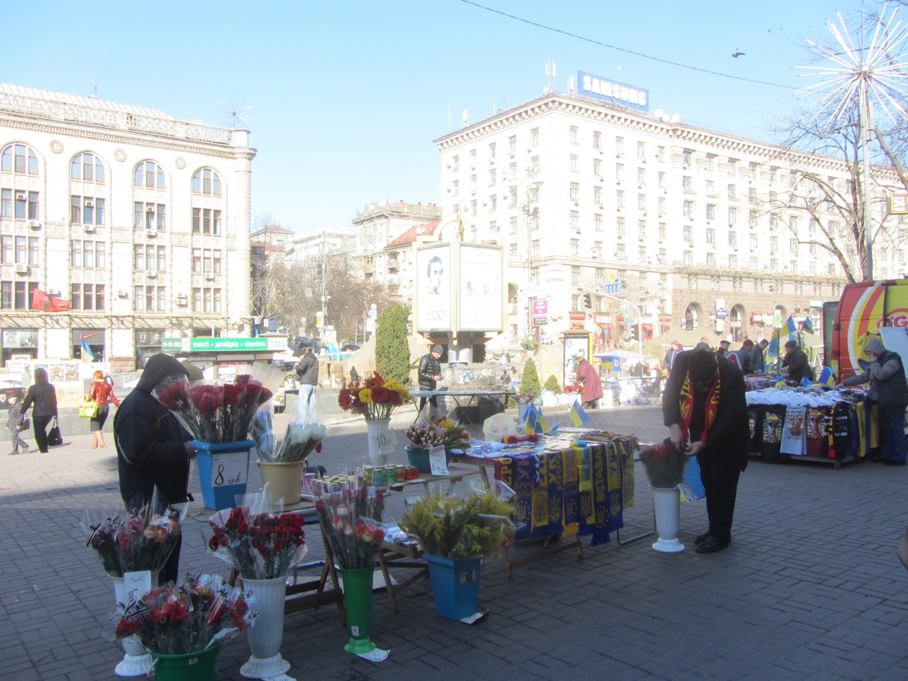 Ну что увидят туристы и рядовые киевляне первым делом, выходя из метро и так понятно. Уличная коммерция, конечно же, процветает во всю. Тут вы можете приобрести цветы примерно от 8ми до 20 гривен за штуку и свечи, чтобы почтить память погибших в результате вооруженных столкновений «народа» со стражами правопорядка.