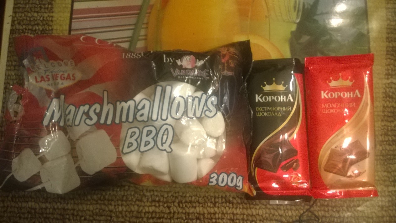 — шоколад (1 плитка черного, 1 плитка молочного).