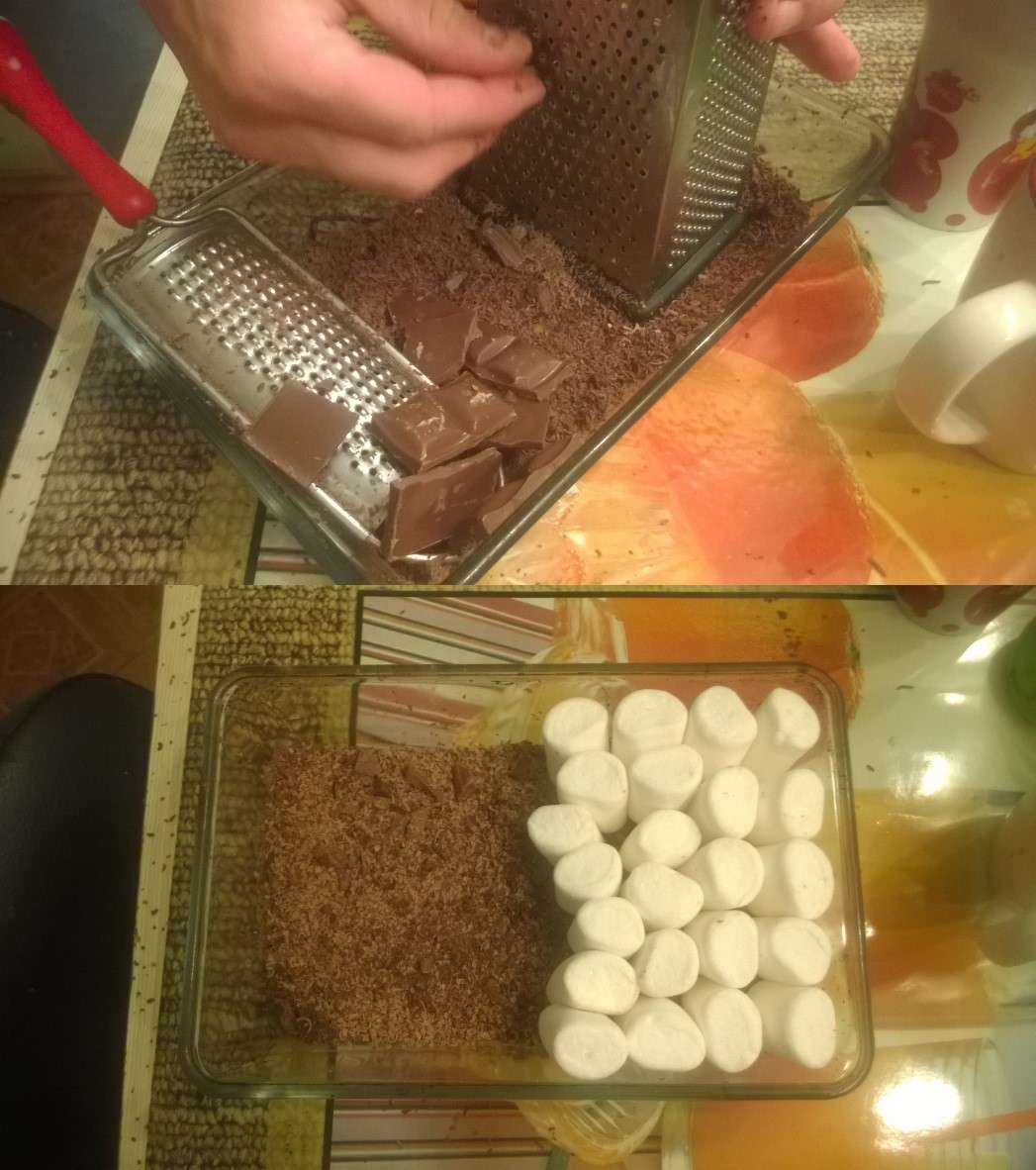 Чтобы приготовить наш простой и оригинальный десерт с маршмеллоу надо натереть на терке, или мелко нарезать шоколад, смешав черный и молочный. Высыпать на дно противня. Сверху выставить ровно зефир «маршмеллоу». Полностью закрыв шоколад.