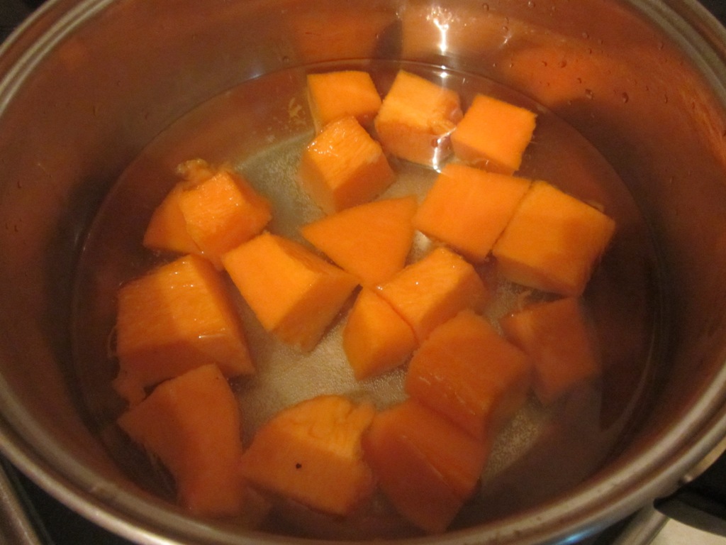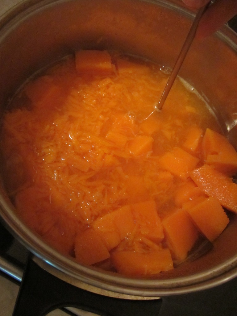 Конечно, если вы терли гарбуз на не крупной терке, а потом варили, то мять его уже не надо. Хотя можно, если вам кажется, что каша состоит из слишком крупных частичек. После этого кашу из гарбуза надо еще немного варить, буквально 3-5 минут.