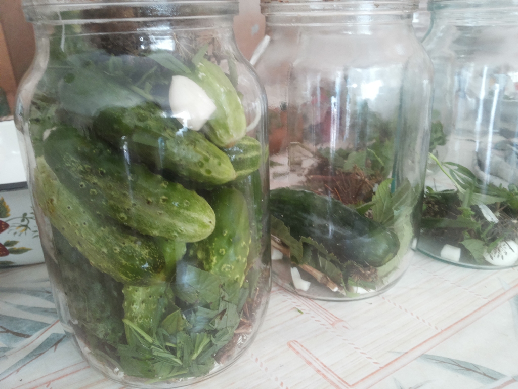 Из данного количества продукции у вас получится 5 литровых банок маринованных огурцов. Как и для любой консервации, тара отбирается без сколов и деформаций. После того как огурцы достаточное время помокли, сложите их в литровые банки, пересыпав порубленными травами. Залейте подготовленным рассолом.