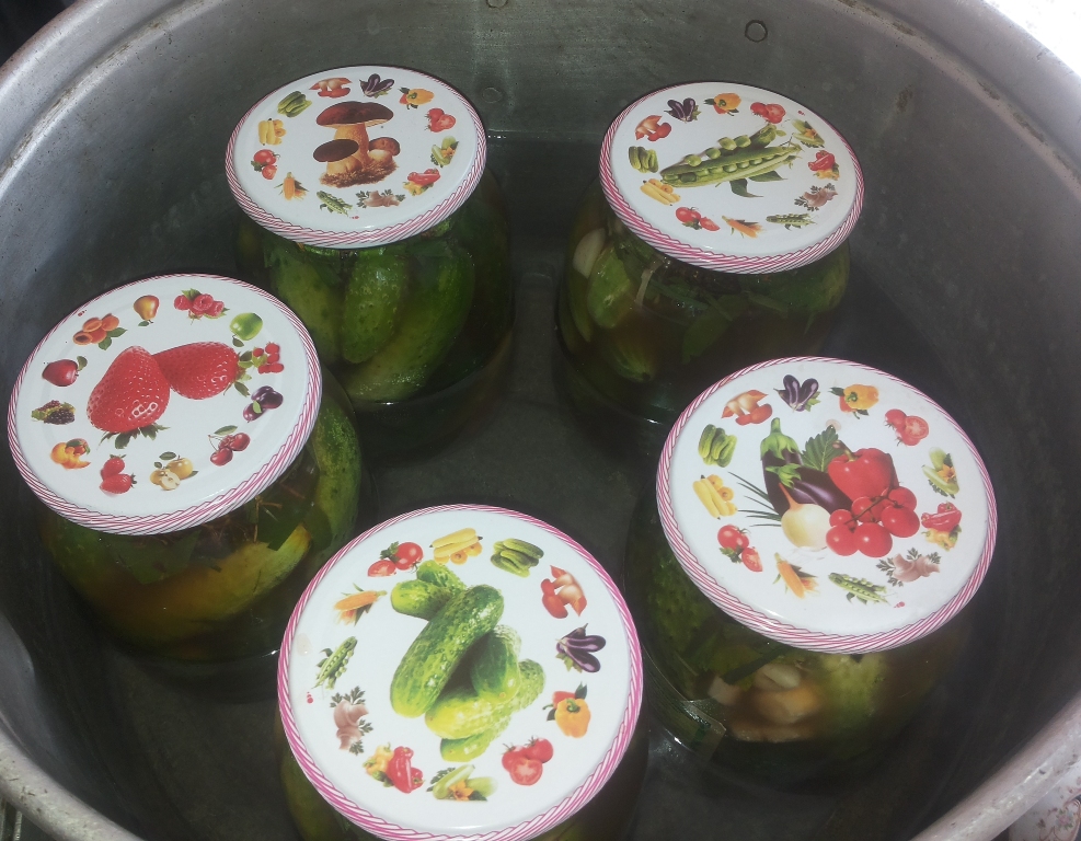 После закипания маринованные огурцы стерилизуют 10 минут. После чего укупоривают. Проверив качество укупорки, оставляют остывать при комнатной температуре. Благодаря достаточному содержанию консервантов: соли и уксуса, такие огурчики хранятся продолжительное время не теряя своих вкусовых качеств.