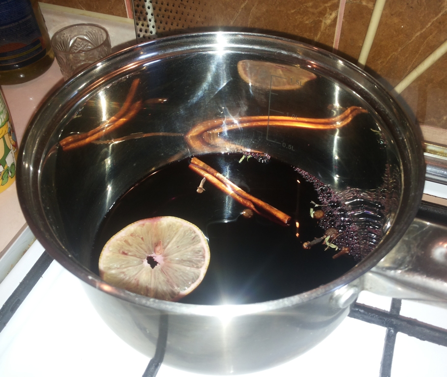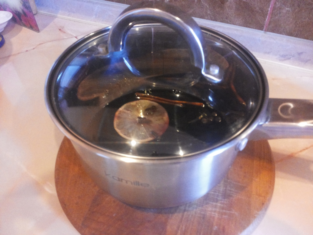 Если в хозяйстве соков не обнаружено воспользуйтесь, красивым и ароматным чаем каркаде. Заварите его как обычно по своему вкусу. И в горячий отвар добавьте корицу, гвоздику, мед и мелко нарезанный имбирь. Прекрасный аромат чаю придадут несколько кусочков лимона. Закройте и дайте настояться.