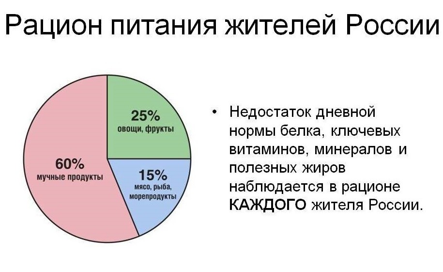 Как я уже упоминал, правильное соотношение белков, жиров и углеводов в пище должно составлять примерно 30% — 20% — 50%, но, к сожалению, на практике среднестатистический житель России далек от этого.