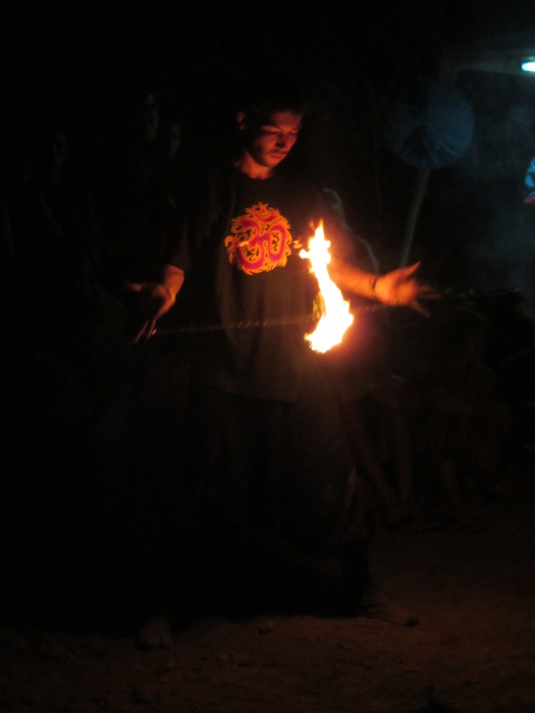 Он очень мастерски обращается с горящим шестом, и более экзотичным снарядом «кометой», то и дело швыряя ее возле лиц зевающих людей. Я даже записал одно из замечательный выступлений с огнем этого парня на видео, думаю подобных профессиональных выступлений фаер шоу практически невозможно увидеть в другом месте да еще и в живую под звуки десятка барабанов.