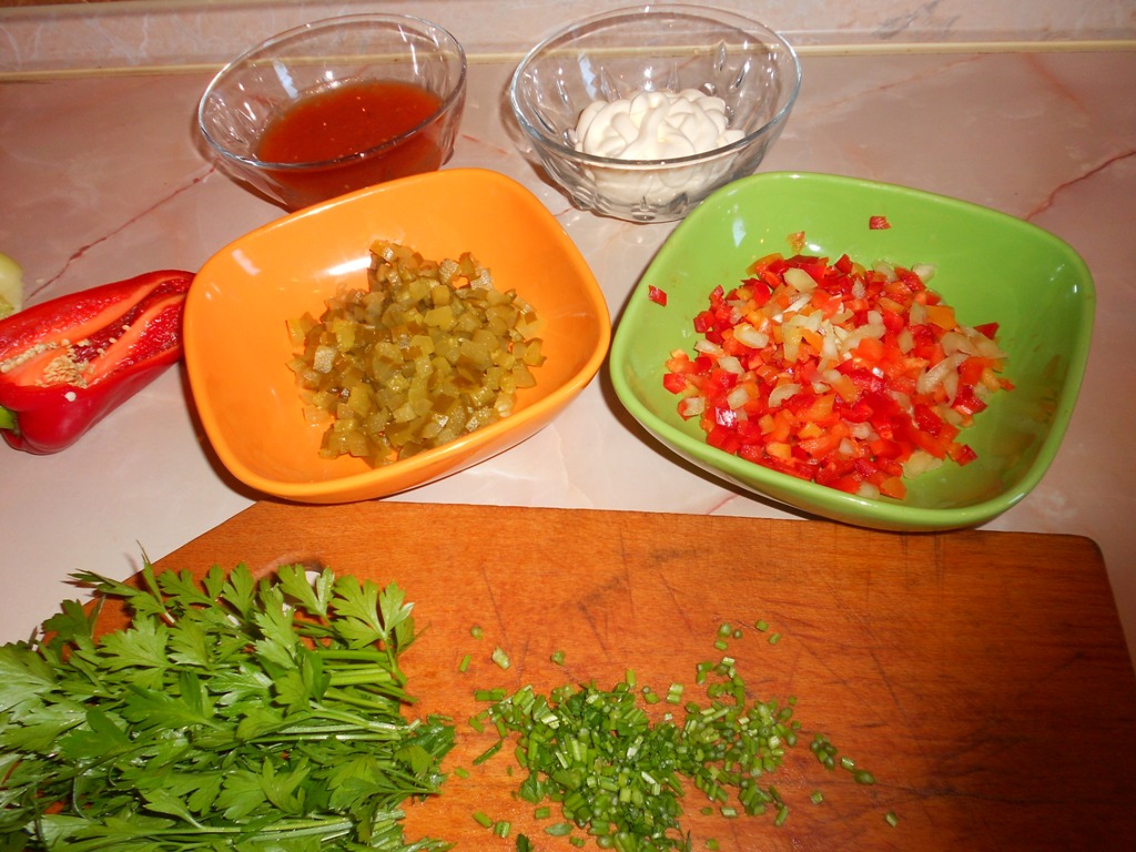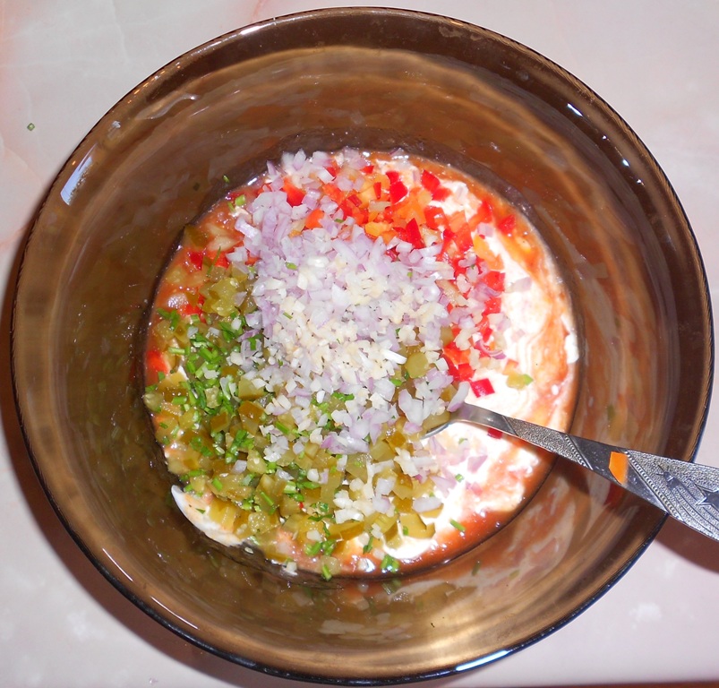 Второй способ приготовления соуса «Тысяча островов» по моему рецепту предполагает нарезку овощей вручную.