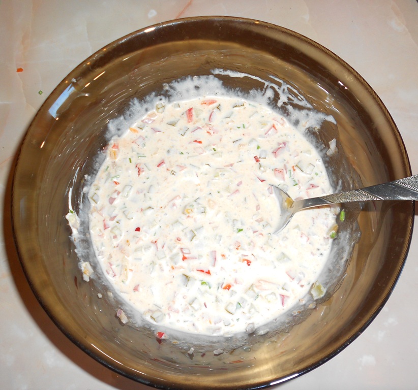 Затем добавить майонез и кетчуп, взбить снова до кремообразной консистенции.