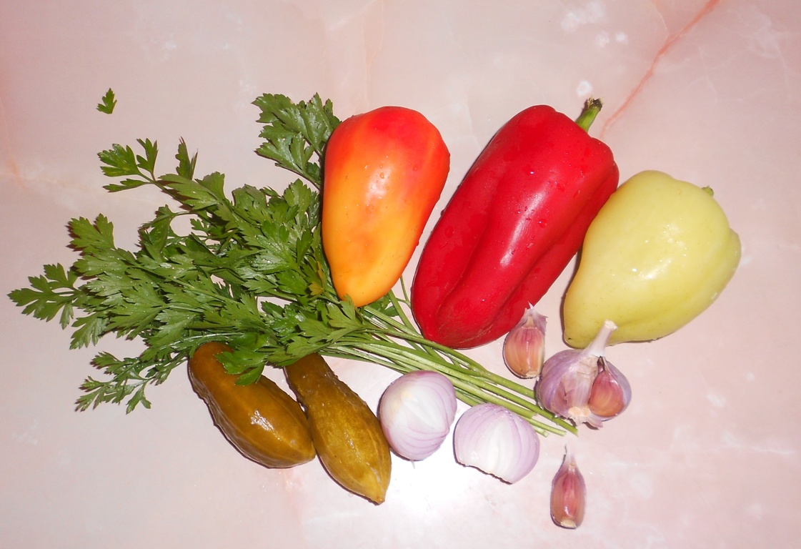 Проще всего для соуса «Тысяча островов» крупно порезать огурец, болгарский перец, чеснок и лук, измельчить стебли петрушки, и взбить в блендере все ингредиенты до однородности.