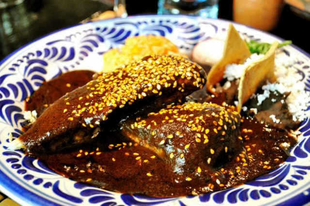 Моле Поблано – в состав этого соуса входит до 100 ингредиентов: мясной бульон, горький шоколад, несколько видов перца, масло, орехи, сухофрукты, семена и разнотравье. Вкус просто незабываемый.