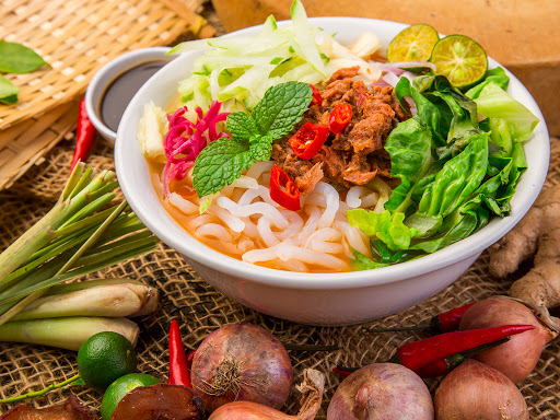 Карри Лакса – готовят с рисовой лапшой на основе куриного бульона и внимание кокосового молока. В тарелку с супом добавляют мясо курицы, креветки, рыбные фрикадельки, половинку вареного яйца, ростки сои и жаренный во фритюре тофу. Оформляют листиками базилика и вьетнамской мяты. Отдельно подают острый соус чили и соломку из свежего огурца.