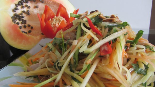 Кстати, этот салат можно приготовить и самостоятельно, для этого нужно взять папайю (можно заменить её и зеленым манго). В общем, нарезать фрукт тонкой соломкой, смешать с жареным арахисом, стеблями молодой фасоли, свежим огурцом и помидорами.