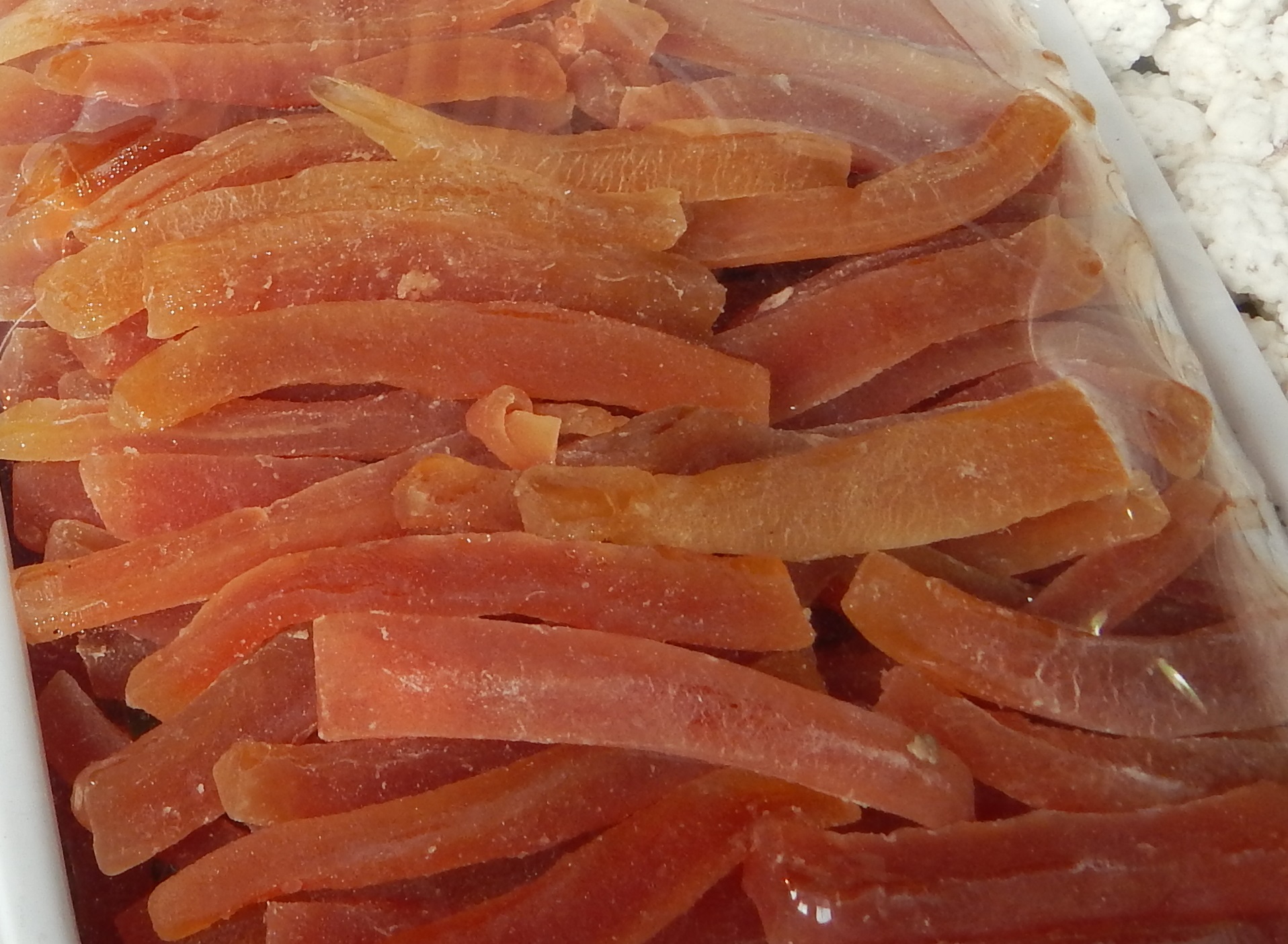 Цукаты из папайи обычно розовато-красной окраски сладкие на вкус, с приятным ароматом понравились многим жителям Европы и Азии. Форма цукатов дольки, кусочки или ломтики, зависит от производителя, вкусовые качества от формы практически не зависят.